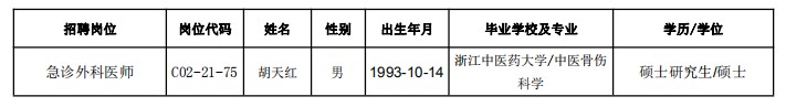 根据2021年3月12日《浙江省省属事业单位2021年特殊专业技术岗位招聘信息》、《浙江中医药大学附属第二医院2021年特殊专业技术岗位招聘公告》,经报名、资格审查、面试、体检和考核,拟聘用下列人员为我单位拟聘用人员并公示如下: