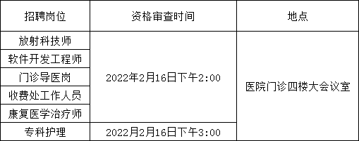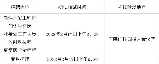 (1)资格复审人员:康复医学科治疗师入围面试人员、专科护理入围面试人员;放射科技师、软件开发工程师、导医、收费处工作人员岗位通过资格初审人员。