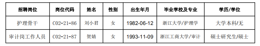 根据2021年6月2日《浙江中医药大学及部分附属医院公开招聘人员公告(2021年第四批)》、《浙江中医药大学附属第二医院公开招聘人员公告(2021年第四批)》,经报名、资格审查、笔试、面试、体检和考核,拟聘用下列人员为我单位拟聘用人员并公示如下:
